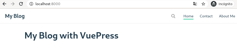Recordemos que vuepress nos provee un tema por defecto que nos simplifica el trabajo, podemos agregar configuraciones específicas para este tema que nos permita agregar enlaces al menú de navegación, agregaremos "/contact" y "/about" al menú de navegación.